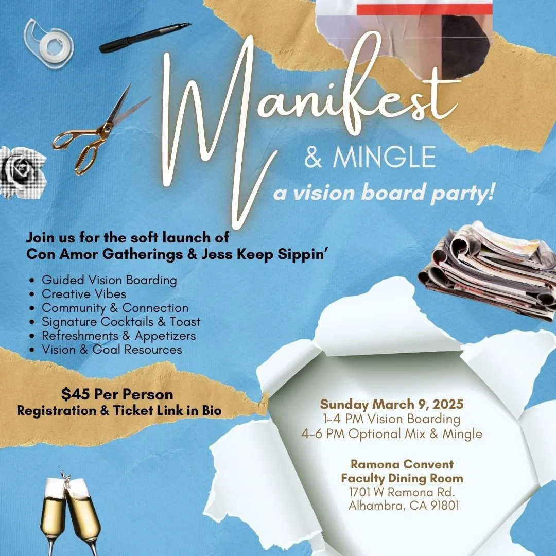 Join us for the exciting (soft) launch of Con Amor Gatherings in collaboration with Jess Keep Sippin’, a monile bartending business by Jessica Fred! We will be celebrating the start of our new ventures by giving you a little taste of what we offer while making vision boards and connecting!